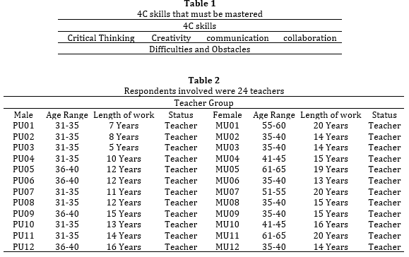According to Ifinedo et al. (2020), teacher education programs ought to provide aspiring teachers with sufficient pedagogical and mathematical training throughout their initial coursework. Because the contents of mathematics teacher education are related to future teachers' knowledge and affect student accomplishment, they need to reconsider techniques to develop future teachers and provide them with the necessary knowledge for teaching (Sailer et al., 2021). It's crucial to retain outstanding educators and to invest in, support, and encourage their abilities (Vidergor & Ben-Amram, 2020). Raising the bar for education in Indonesia has so made increasing the caliber of instruction essential. Classroom activities that heavily rely on their professionals and have a direct impact on their students' learning are intrinsically linked to the quality of teaching and learning (Huang et al., 2020). It suggests that teachers' skills need to be improved, especially when it comes to imparting 4C skills.
