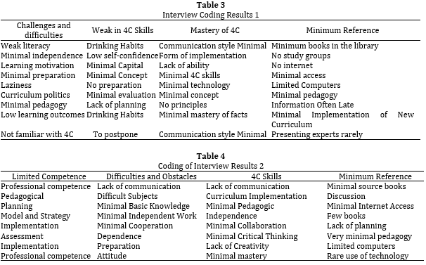 Prospective math instructors' conceptual knowledge and competence to teach 4C skills is lacking. As seen in Table 3, the incapacity and conceptual lack of knowledge of 4C skills among teachers arises from two categories constructed from fifteen codes. Out of ten participants, only four are able to fully define what 4C skills are and why 21st-century teaching and learning are necessary. All 12 respondents, however, feel that 4C skills are essential for aspiring math teachers because the current curriculum demands them, which motivates them to make every effort to implement 4C skills. Ten respondents acknowledge that they need to get better at teaching 4C skills. Respondents [MU09 and MU08] contended that the lecturing staff is the source of the challenges as, while we want aspiring teachers to interact and communicate, we fail to provide them with learning opportunities that foster the development of 4C abilities. Respondents [PU05, PU06, PU07, and PU08] contended that because of challenges such inadequate competence development, aspiring math teachers are less likely to adopt 4C skills. According to respondents [PU01 and PU02], one of the things that determines how well potential math teachers are able to enhance their 4C skills is their ability to teach. As math coordinators, respondents [MU08 and MU09] contended that there weren't usually any barriers. Many senior teachers, though, resisted change. According to this research, one of the things impeding higher education's teaching staff's ability to assist aspiring math instructors in honing their 4C skill teaching abilities is their ability to plan 4C skill-based lectures. This result is in line with the arguments made by Ghosn-Chelala (2020), who contend that a few of the challenges include insufficient training for teaching staff, a shortage of certified teacher educators, and a lack of focus in educational institutions. Table 4 illustrates this pattern in the situations of school teachers. Ten educators acknowledged that they needed more training and development to fully grasp the 4C competencies of the 21st century. Respondents [MU01, MU02, MU03, and MU05] contended that teachers need to be highly competent since teaching will become more difficult in the future and if we don't prepare for this now, our education would fall behind. Teachers need to read a lot, according to respondents [MU04, MU06, and MU07]; they are lifelong learners, not just transitory ones. Students would suffer if a teacher lacks competency, and [MU09 and MU10] stated that teacher aptitude is crucial, particularly in learning methodology and learning models. According to the respondent [MU08], teachers require a guidance program since they are having trouble grasping the topic. Furthermore, there are issues with teachers' motivation to implement 4C skill-based instruction in this instance. The absence of excitement among students for learning has made teachers less motivated. For instance, [MU08] claimed that pupils had little enthusiasm in studying, which is a difficulty I encounter. Teachers become less motivated as a result of this predicament. According to respondent [MU10], pupils are uninterested in math classes. When pupils show no interest, we must be more creative and self-motivated. It was discovered that there is a need to enhance instructors' capacity and drive to teach mathematics in a way that develops students' 4C skills. Higher education institutions should base their professional development programs for teachers on this conclusion. In this instance, 4C skills education and innovation should be prioritized in mathematics teacher preparation programs at universities so that aspiring math educators can fulfill the needs of teaching and learning in the twenty-first century.