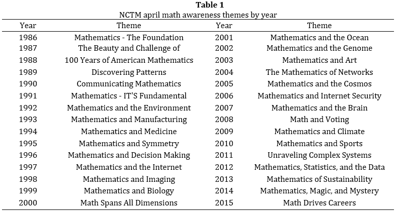 Although mathematics emerged with simple needs based on counting, numbers and operations (arithmetic), it is seen that human efforts to understand nature, daily needs and developing science and technology have turned into very complex concepts, structures and forms, and mathematics has gone beyond what is seen in curriculum (Stewart, 2020). However, it has been observed that the abstract concepts and connections discovered by mathematicians sometimes find their place in nature, science, and technology years or even centuries later. The National Council of Teachers of Mathematics (NCTM) has been celebrating April as "Mathematics Awareness Month" since 1986 in order to increase awareness of the usefulness of mathematics in our lives and in society (Ernest, 1996). When we look at the themes of this month in the Table 1, which is celebrated at the national level, we see that mathematics follows a course that touches on daily life and its connection with different disciplines. The themes of "Mathematics Awareness Month" between 1986 and 2015 are given in the table below (ASA, 2023).