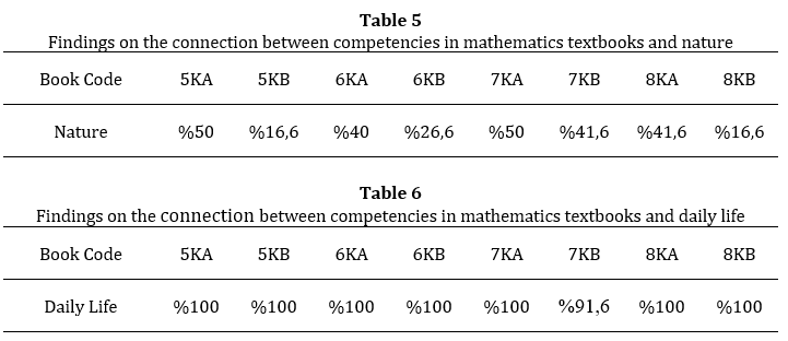 Table 6 shows the findings and comments regarding the fifth sub-problem of the research, the extent to which examples of the "mathematics - daily life" connection are included in middle school mathematics textbooks. When Table 6 is examined, it is seen that in 75% of the achievements in the 5KA coded textbook, 16.6% of the achievements in the 5KB coded textbook, 66.6% of the achievements in the 6KA coded textbook, 80% of the achievements in the 6KB coded textbook, 83.3% of the achievements in the 7KA coded textbook, 50% of the achievements in the 7KB coded textbook, 100% of the achievements in the 8KA coded textbook, 25% of the achievements in the 8KB coded textbook included examples related to daily life. In addition, it is an important finding that the achievements in the books include at least one example involving the "mathematics - daily life" connection.