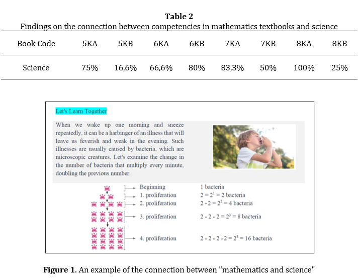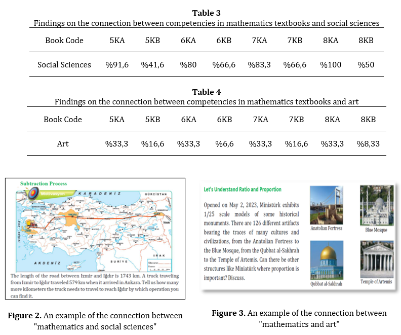 In the education systems of developed countries, textbooks have always been an important source of information and auxiliary educational tools in the implementation of curriculum (Konak, 2018). Textbooks serve as companions that facilitate learning environment in which teachers in delivering lessons in a more systematic, planned manner without disrupting the coherence of the topics. Simultaneously, they empower students to revisit and self-learn the presented content at their own pace and in the desired amount whenever they wish (Sefa, 2009). It is seen in the research that textbooks, which serve as a bridge between the curriculum and the student and whose importance is clearly emphasized, need to be constantly studied and improved in order to reach the goals in curriculum (Küçükahmet, 2011). Therefore, studies and recommendations regarding the examination, evaluation, and development of these supplementary resources to equip students with process skills have gained significance. This research aims to reveal the extent to which the approach of implementing mathematics education by integrating it with other fields, as prescribed by the renewed mathematics curriculum in Turkey since 2005 and widely mentioned in the literature, is reflected in middle school mathematics textbooks. In addition, this research aims to make suggestions by seeking answers to the following research problems regarding these auxiliary resources, which are so valuable and useful for students and education: