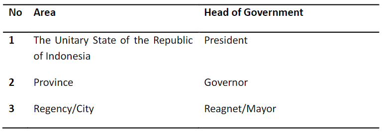 Fourth is the hierarchy of the constitutional system. The Indonesian constitutional system is a unitary state system in the form of a republic (Government of the Republic of Indonesia, 1945a). The Unitary State of the Republic of Indonesia is divided into provincial areas and provincial areas are subsequently divided into regencies and cities. Therefore, orderly, the Republic of Indonesia covers the entire territory of Indonesia with the President as the leader. The Provincial region is a region that encompasses several Regencies and Cities with the Governor as the leader, while the Regency and City regions are autonomous regions consisting of several sub-districts with the Regent and Mayor as leaders. From the explained structure, it is apparent that the leadership structure is the President, Governor, and Regent or Mayor.