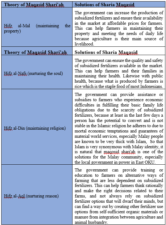 In the context of the scarcity of subsidized fertilizers for farmers in East OKU, the theory of Maqasid Shari'ah can be applied to provide solutions.