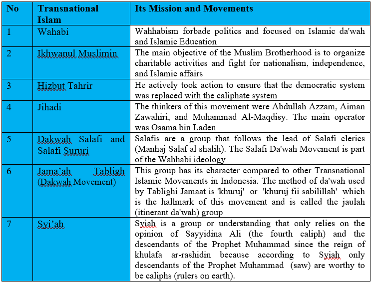 Transnational Islamic Movements are Islamic organizations that operate in various circles of the country. The movement aimed to purify the teachings of Islam influenced by Western culture from Europe in the 20th century. Transnational Islamic Movements in Indonesia are: (1) Wahhabi, the Wahabi movement is difficult to accept in Indonesian society because Wahabi teachings are very strict against outside influences and reject Islamic acculturation and culture (Bid'ah) while Indonesian society blends with Islamic culture and values. (2) Muslim Brotherhood, This organization had a role in the independence of the Republic of Indonesia. (3) The Hizb ut-Tahrir, in Indonesia, this organization was dissolved because it rejected the foundation of the state (Pancasila and the 1945 Constitution) and insisted on running the wheels of government with the Caliphate. (4) Jihadi, this understanding is considered very dangerous because they understand that can trigger conflict and this understanding is not suitable in Indonesia. (5) Salafi and Sururi proselytizing, they do not provoke the state but they think that their group is the one who most follows the sunnah of the Prophet (peace be upon him). (6) Tabligh Jamaat, not including radical Islamic organizations, does not want Indonesia to become a Khilafah (7) Shia, this group is recognized for its existence in Indonesia, but the MUI (Indonesian Ulema Council) considers this sect as a heretical sect.