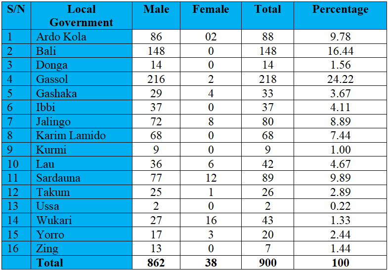 - There are 900 proprietors of Tsangaya Qur’anic schools in Taraba State, with 862males and 38 females.
