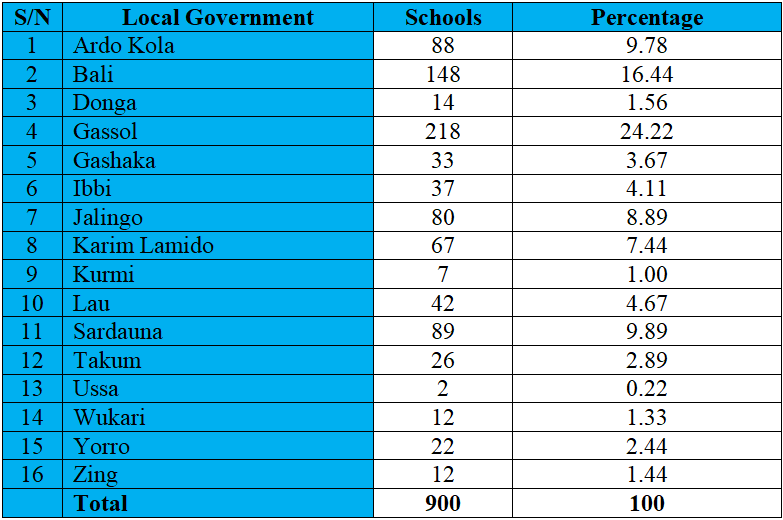 - There are 900 functional Tsangaya Qur’anic schools in Taraba State.