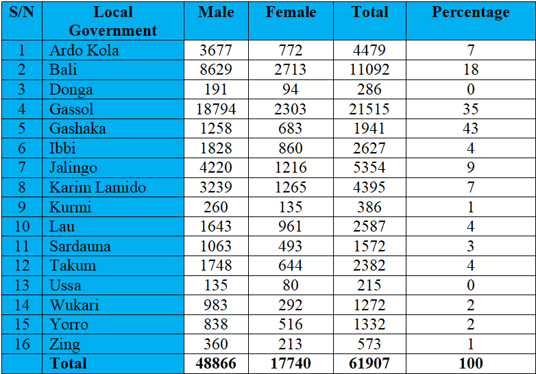 - The total enrollment figures of Tsangaya Qur’anic schools across Taraba State are 61,882, with 48,866 boys and 17,740girls