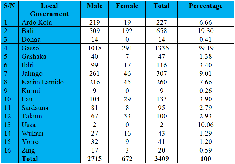 - The number of teachers at Tsangaya Qur’anic schools in Taraba State stands at 3,409, with 2,715 males and 672females.