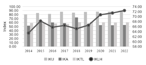 In Indonesia, the Environmental Quality Index (IKLH) is used as a measurement to assess the national environmental quality during specific periods. IKLH data is obtained from the Ministry of Environment and Forestry (KLHK). To obtain the IKLH score, three indicators are used: IKA (Water Quality Index), IKU (Air Quality Index), and IKTL (Land Cover Quality Index). Figure 1 shows the growth of IKLH from 2014 to 2022.