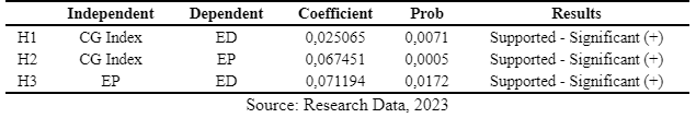 Table 11 also shows that Corporate Governance has a significant positive influence on Environmental Performance with a probability value of 0.0005 and a coefficient value of 0.067451, indicating the confirmation of H2. Strong Corporate Governance can lead to more effective monitoring and reporting of environmental performance. With effective oversight mechanisms, companies can improve and regularly report their environmental performance. This not only enhances the company's accountability to environmental issues but also provides stakeholders with the necessary information to make decisions based on the company's environmental performance.