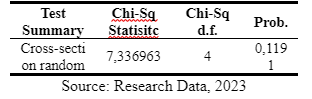 Based on the output results from models I and II, it can be observed that the probability result of the Chi-Square Cross Section is 0.0000. This indicates that the probability value is below α (α = 0.05), which means that the most suitable regression model based on the Chow Test is the Fixed Effect Model (FEM). Therefore, further testing will be conducted using the Hausman Test.