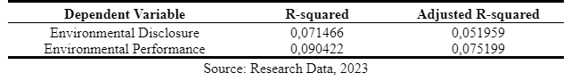 Table 13 presents the adjusted R-square values for both Model I and Model II. The adjusted R-square for Model I is 0.051959, signifying that the independent variables in this model explain approximately 5.1959% of the variance in Environmental Disclosure. The remaining percentage is attributed to other variables not considered in this research. On the other hand, the adjusted R-square result for Model II indicates that 7.5199% of the dependent variable can be explained by the independent variables examined in this study, while the rest is accounted for by unexamined variables.
