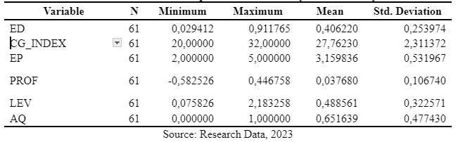 Corporate Governance variable is measured using the Corporate Governance Principle Implementation Index. The minimum value is 20.00000, achieved by PT Indo-Rama Synthetics Tbk in 2018, indicating that the company does not meet the minimum standards in practices, policies, and procedures governing its operations and oversight. The maximum value of Corporate Governance is 32.00000, observed in PT Aneka Tambang Tbk and PT Argo Pantes Tbk, indicating that both companies have clear and well-organized organizational structures, with transparent policies and procedures that are understood by all stakeholders involved, along with strong and independent oversight. The average value of Corporate Governance is 27.76230 with a standard deviation of 2.311372, indicating that the research data has relatively low variability.