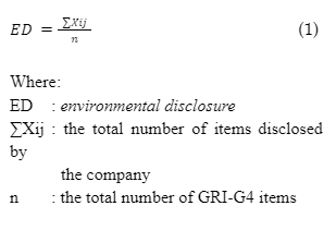 Environmental disclosure is one of the ways companies provide information to external parties regarding the company and its impact on the environment and social aspects. The variable of environmental disclosure is measured using the Global Reporting Initiative (GRI-G4) [1]. If an item is disclosed by a company, it receives a score of 1, and if an item is not disclosed, a score of 0 is assigned [22]. The following formula is used [20]: