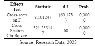 To determine the appropriate model between Common Effect Model (CEM) and Fixed Effect Model (FEM), the research utilizes the Chow test. If the probability (p) is less than α (α = 0.05), then FEM or REM (Random Effect Model) is considered the more suitable model, followed by the Hausman test. On the other hand, if the probability value is equal to or greater than α (α = 0.05), then the preferred model is CEM, followed by the Lagrange Multiplier test. In this study, the Chow test results can be found in Table 3 and Table 4 below.