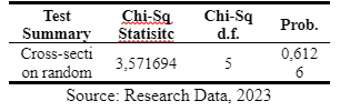 The Hausman Test results can be used to determine the best regression model between FEM and REM. If the p-value is less than α (α = 0.05), then FEM is the appropriate model. However, if the probability is equal to or greater than α (α = 0.05), then the suitable models are REM or CEM, followed by the Lagrange Multiplier test. In this study, the Hausman Test results are shown in Table 5 and Table 6 attached below:
