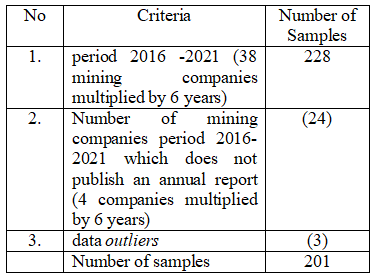 The population used in this study are mining companies listed on the IDX for the 2016-2021 period. Determination of the sample in this study using a purposive sampling method in which the sample used must meet certain predetermined requirements. The criteria set are mining companies listed on the Indonesia Stock Exchange (IDX) for the 2016-2021 period, The final number of samples used in the study is presented in the following table: