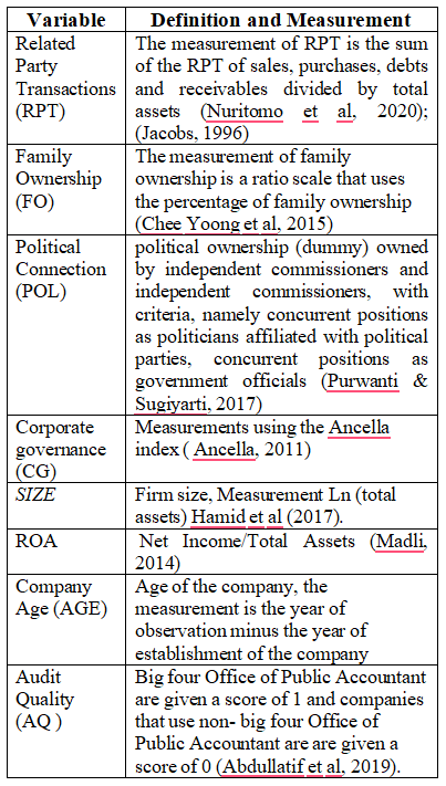 The dependent variable or dependent variable is the main variable that is the focus of a study and in a study it is also possible to have more than one dependent variable because of differences in quality, volume, and others. There may be differences in the effect of other variables for two different dependent variables. In this study using RPT as the dependent variable, family ownership and political connections as independent variables, good corporate governance as moderating variables and audit quality, firm age, profitability and firm size as control variables.