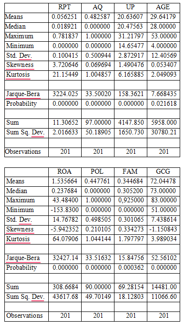 Related party transactions (RPT) as measured using the sum of related party transactions of sales, purchases, payables and receivables divided by total assets in this study have an average of 0.056 with a maximum and minimum value of 0.781 and 0, respectively. related party with a maximum value of 0.781 indicates that the level of related party transactions practiced is high, around 78%. This indicates that the sample firms In this study, the practice of related party transactions is carried out from several aspects of transactions such as debts and receivables to achieve certain goals. However, there are also those who do not conduct transactions with related parties in certain years