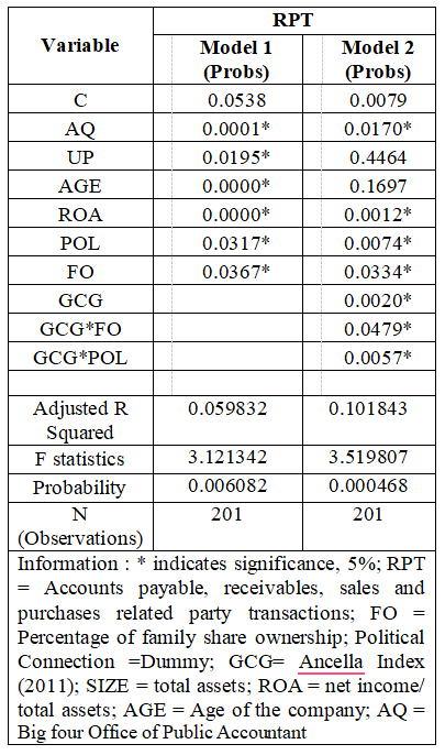 fourth hypothesis, namely that GCG weakens the influence of political connections on related party transactions, is accepted. Statistical test results show that GCG can weaken the influence of political connections on related party transactions with a probability value of 0.0057 below 0.05 . In line with the research of Tariq et al (2022) showing that Egyptian companies are heavily influenced by politically connected boards of directors that corporate governance practices can reduce the effect of RPT.