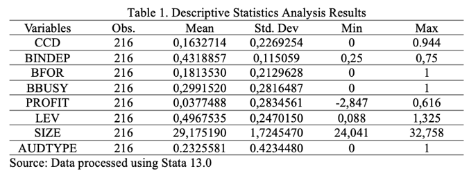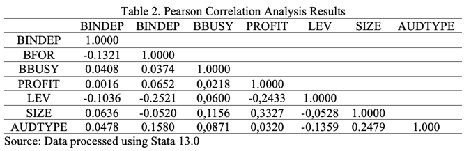 Table 1 displays descriptive statistics for the variables utilized in the study. The average CCD value is 0.16, with a minimum value of 0 and a maximum value of 0.94. This reflects the fact that the majority of businesses provide little information about climate change. This could be due to the lack of rules in Indonesia forcing public firms to report on climate change. The proportion of independent member on the board of commissioners varies between 25% and 75%. Furthermore, foreign commissioners make up 18% of the total. In contrast, the percentage of busy commissioners in businesses can approach 100%, with an average of 30%.