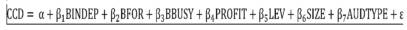 Furthermore, board independence (BINDEP), foreign commissioners (BFOR), and commissioner activity are variables that function as determinants in this study. BINDEP is calculated by dividing the number of independent commissioners by the total number of board members. The proportion of foreign commissioners (BFOR) is calculated by dividing the total number of board members by the number of foreign-nationality commissioners. If a commissioner holds three or more jobs at the same time, they are termed busy (Trinugroho et al., 2022). In this study, commissioner busyness (BBUSY) is calculated by dividing the number of busy commissioners by the total number of board members.