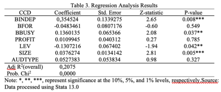Table 3 shows the results of the regression analysis used to test the hypotheses. The first finding suggests that board independence improves climate change disclosure (b= 0.355; p-value = 0.008). This implies that the first hypothesis is correct. Companies with a higher share of independent commissioners, according to Khaireddine et al. (2020), will improve their disclosure policies. Independent commissioners have strong ethical standards. They will encourage the corporation to share more environmental information in order to retain its reputation among stakeholders. An independent board is one that is not subject to pressure from management or shareholders, as internal boards are (Hussain et al., 2018). This has an impact on their ability to make decisions, particularly in terms of transparency through reporting.